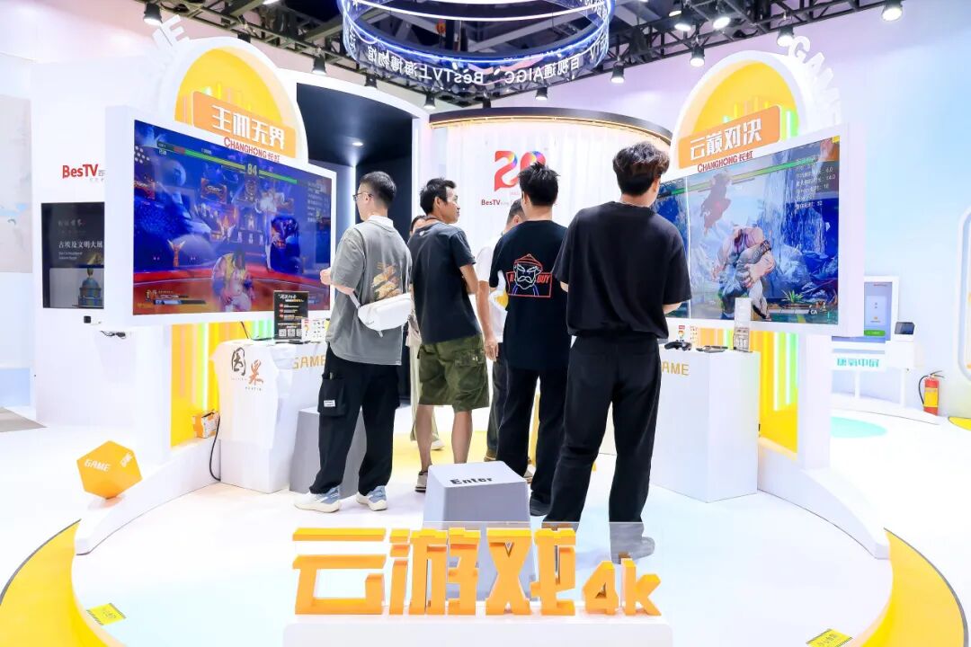 在互动娱乐领域,百视通云游戏通过自研的云端实时渲染与低延迟流传输技术,打破硬件壁垒,将主机级游戏品质无损、流畅地运行于多种终端。展会现场,《拳皇15》展示了毫秒级响应的竞技流畅性,《明末》则呈现了云端无损渲染的高画质表现,一动一静,生动诠释家庭娱乐新图景。目前,该技术已登陆长虹电视大屏,提供“即点即玩”的沉浸式云游戏服务。