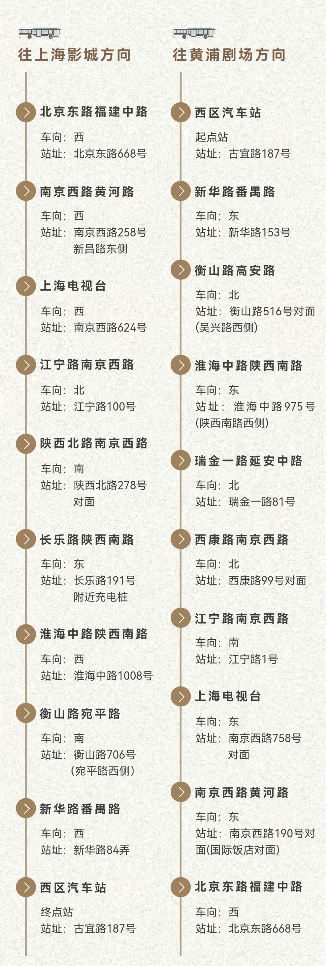 两辆主题巴士的车身外侧、内部设计、车载屏都妆点了上影节主题元素,以西区汽车站及人民广场武胜路枢纽为起讫,单程全长约 10 公里。坐着主题巴士去地标影院,看一场电影节展映片,一定会成为2024年最值得打卡的文艺项目。观众还可参加拍照打卡活动换取专属纪念车票,意义非凡。