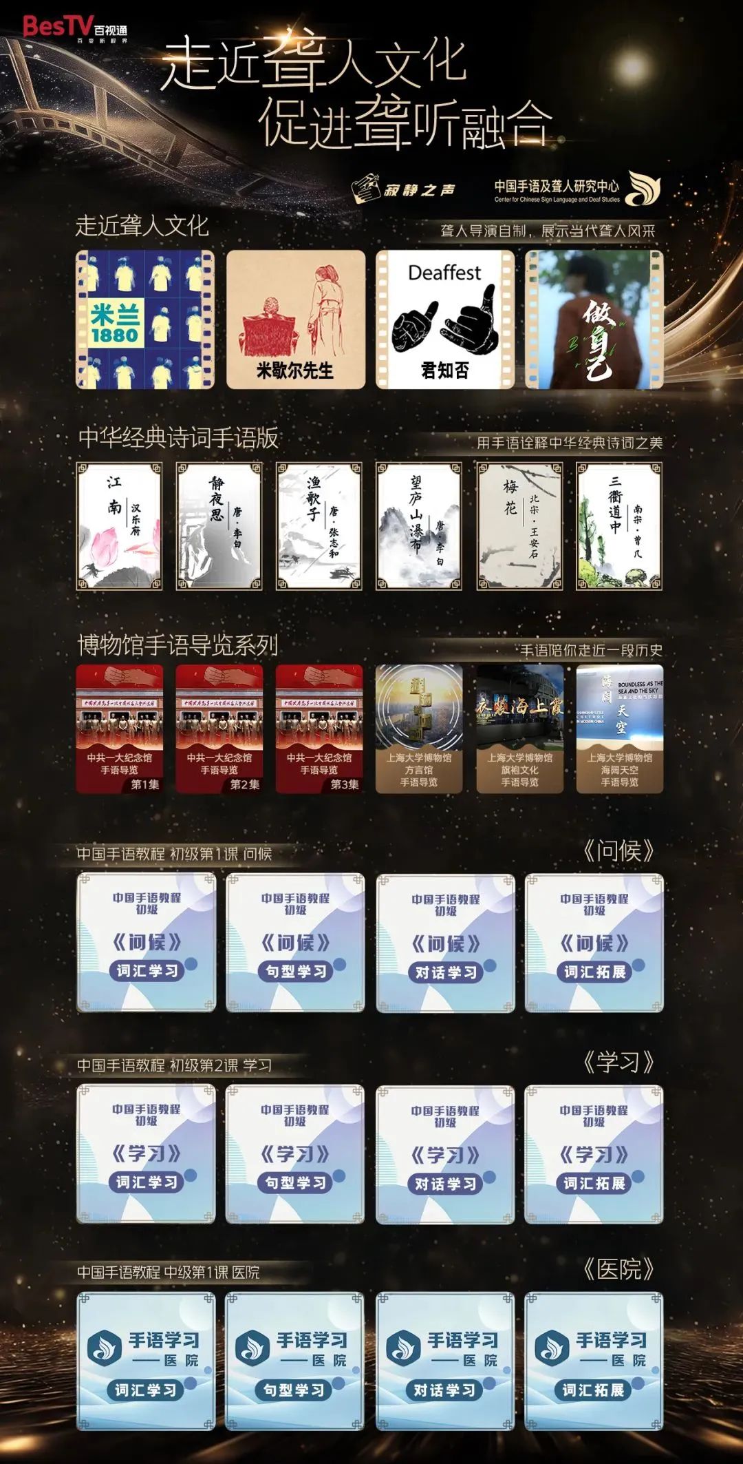百视通作为“SMG无障碍文化艺术创作联盟”一员,在志愿讲解、演出服务、技术支持、内容创作等多方面持续发力,为视听障人群搭建一条线上“视听盲道”,让他们能够享受光影艺术的魅力。近期,百视通还将限时展映多部由上海寂静之声文化传媒有限公司提供的聋人导演影片以及由上海大学中国手语及聋人研究中心制作的《中华经典诗词手语版》、博物馆手语导览系列、《中国手语教程》等内容,与视听障人士一起过节,畅享光影魅力,感受城市温度。