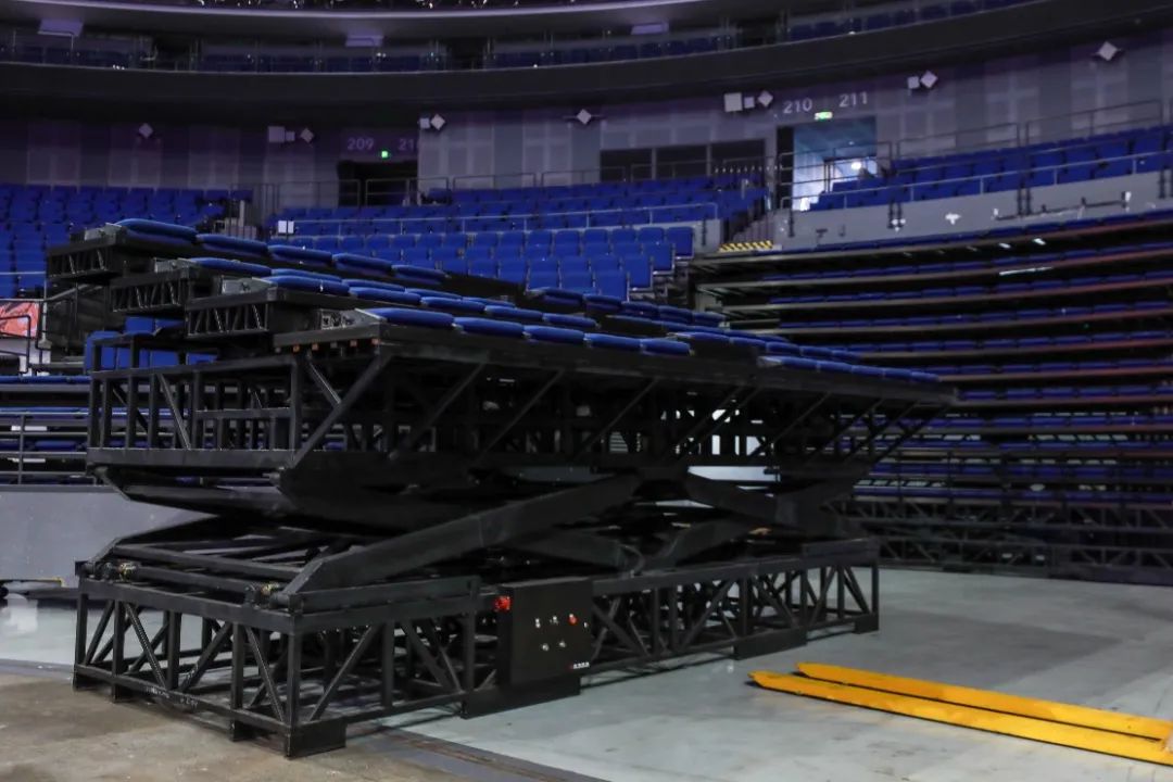 为提升舞台转换的灵活性及创新性,梅奔中心在前期工程技术方面做了充分准备。场馆充分利用原有设施设备的功能性,拆除东面两侧固定看台,延伸舞台东部空间,同时利用伸缩看台的一键可升降功能,实现伸缩座椅的搭建时间从原本18小时缩短至12小时,并有效增强了伸缩看台的稳定性以及搭建和拆除的安全性。